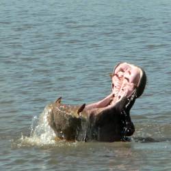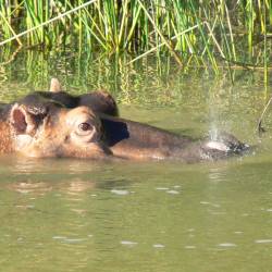 Seenlandschaft: Nilpferde und gut getarnte Krokodile. Über-