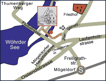 Über den Ostring bzw. vom Nürnberger Zentrum kommend in die Ostendstraße einbiegen. Erste Straße nach dem "Mögeldorfer Plärrer" (Kreuzung Ostendstr./Schmausenbuckstr.) ganz steil links abbiegen in die Mögeldorfer Hauptstraße. Nach der Rechtskurve (abbiegende Vorfahrtsstraße) könnt Ihr noch vor der Brücke nach rechts in die kleine Straße "Leo-Bayer-Weg" und gleich wieder rechts in den "Kirchenberg" abbiegen.