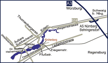 Ausfahrt "Nürnberg/Behringersdorf", nach links auf die B14, Richtung Nürnberg abbiegen. Nach Ortsschild Nürnberg geradeaus der Erlenstegenstraße folgen. Nach etwa 1000m nach links in den Thumenberger Weg abbiegen (analog Wegweiser "Tiergarten") und dem Straßenverlauf folgen. An der T-Kreuzung (abbiegende Vorfahrtsstraße) nach links in die Flußstrasse abbiegen. Nachdem Ihr den Wöhrder See überquert habt, könnt Ihr gleich nach der Brücke nach links in die kleine Straße "Leo-Bayer-Weg" und gleich wieder rechts in den "Kirchenberg" abbiegen.